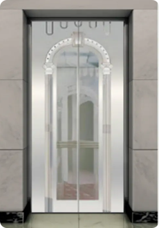 Потолок: Зеркальная нержавеющая сталь, двойная арочная акриловая пластина, светодиодная подсветка. Стены кабины: Платформа из напыляемой стали, зеркальная поверхность из нержавеющей стали с травлением. Перила: Цельная круглая труба из нержавеющей стали. Пол: ПВХ (стандартный), мрамор (опционально)..
