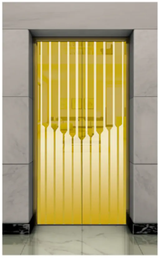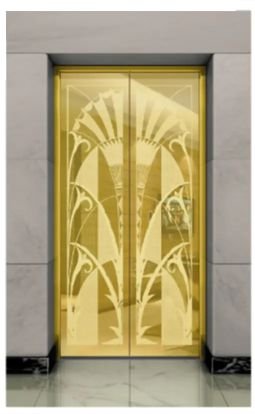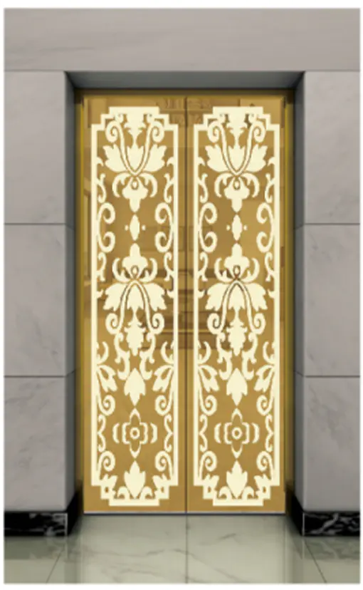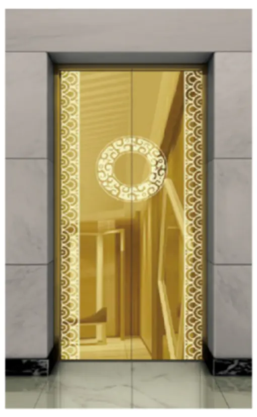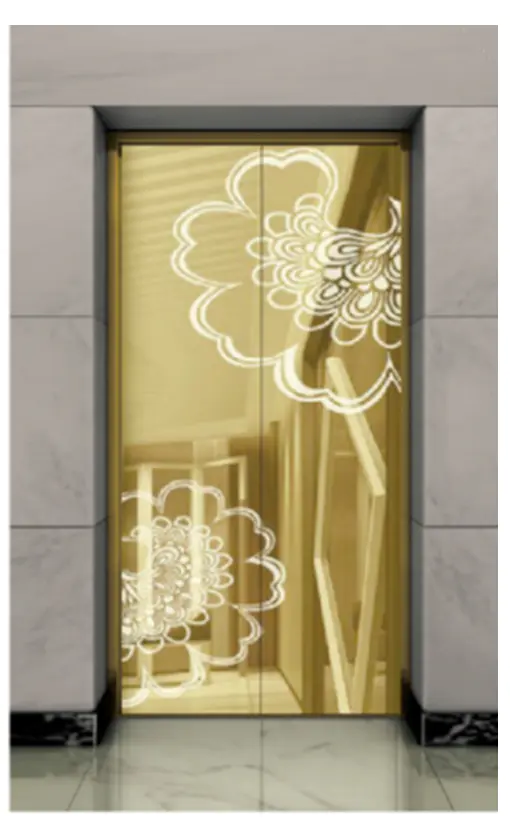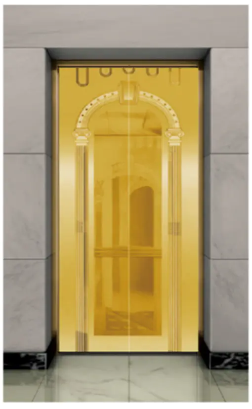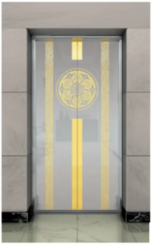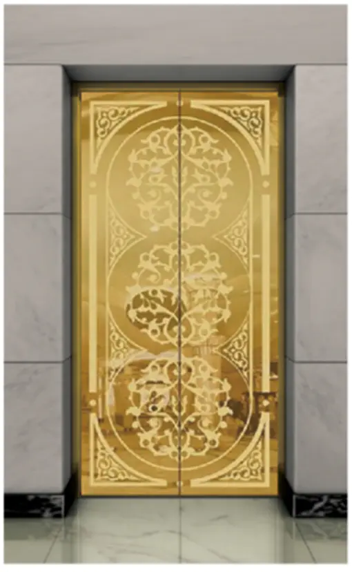 Потолок: нержавеющая сталь с зеркальной отделкой под титановое золото , светодиодная подсветка, декоративная скрытая светодиодная лента с зеркальной гравировкой. Стены кабины: нержавеющая сталь с зеркальной отделкой под титановое золото. Перила: круглые перила с зеркальной отделкой под титановое золото. Пол: ПВХ (стандартный), мрамор (опционально).