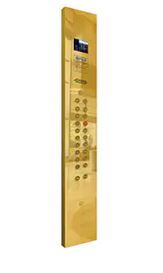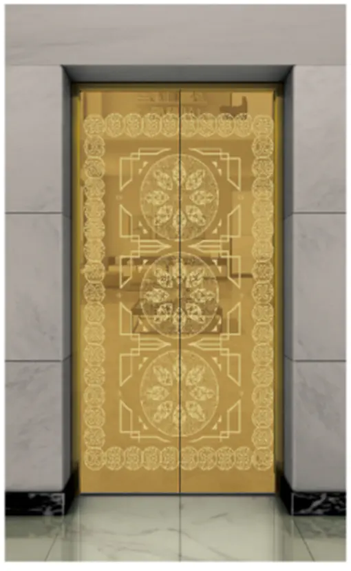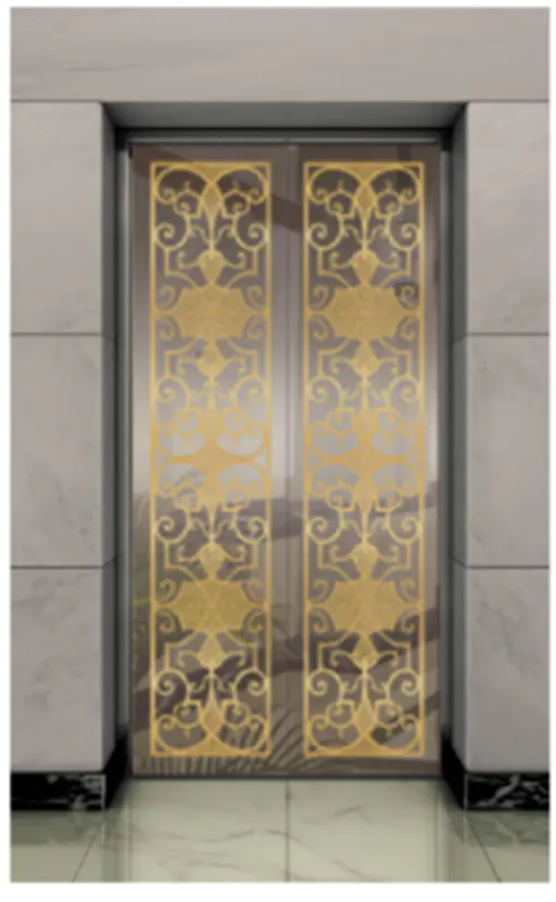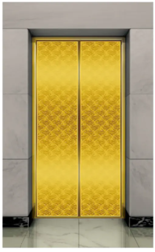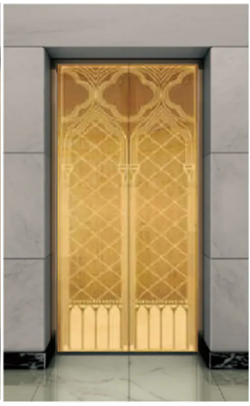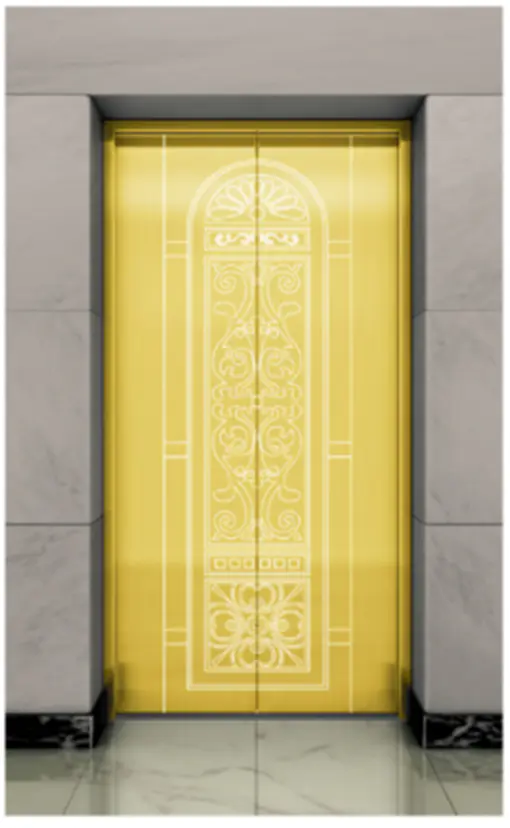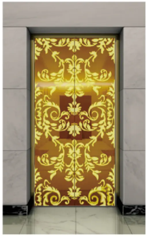 Потолок: нержавеющая сталь с зеркальной отделкой под титановое золото , светодиодная подсветка, декоративная скрытая светодиодная лента с зеркальной гравировкой. Стены кабины: нержавеющая сталь с зеркальной отделкой под титановое золото. Перила: круглые перила с зеркальной отделкой под титановое золото. Пол: ПВХ (стандартный), мрамор (опционально).